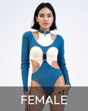This bodysuit is a total showstopper! I love the net panels and the color blocking. It's so sexy and flattering. The cutouts add a touch of edginess, and the asymmetrical design looks different and unique